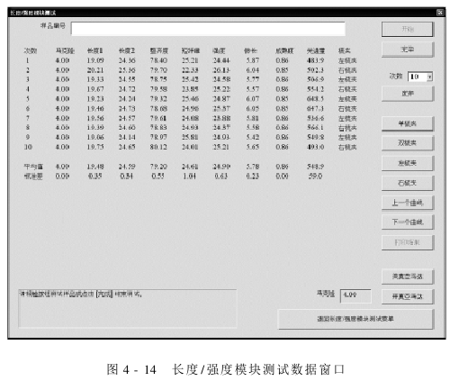 当输入样品编号,各个选项设置完毕后,就可以点击“开始测试”选项,进入长度/强度模块测试数据窗口。这时操作人员将样品放入取样器中,点击“开始”选项,然后按下长度/强度箱体操作台上的开始按键进行测试。