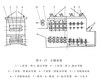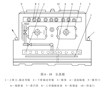 图4-19所示为长蒸箱,除可皂蒸、热蒸外,也可碱蒸。箱中装有上下两排导布辊,上排9根,奇数为主动辊,均由力矩电动机单独驱动。下排10根,均为被动导辊。