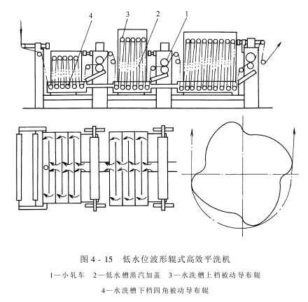 图4-15所示为低水位波形辊式高效平洗机,它的结构特点如下:
