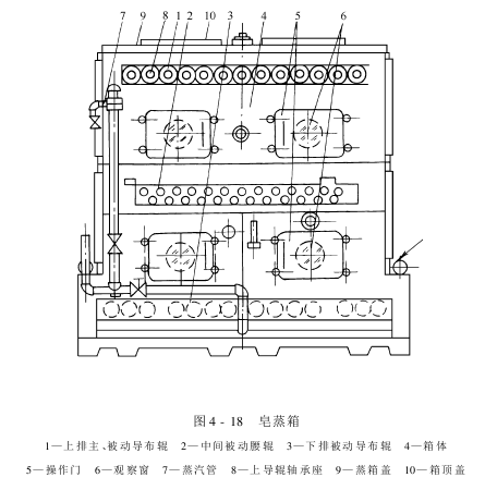 图4-18所示为皂蒸箱,供棉、涤/棉及一般化学纤维混纺化纤织物织物上色及印花后皂煮和热水蒸洗用。箱内安装三排导布辊;上排13根,奇数为主动辊;中间26根小直径腰辊和下排14根导辊均为被动辊。蒸箱铸铁箱体的前后板均为铸铁制蒸汽夹板,用来间接加热,保持箱内温度。箱内底部装8只外套消声筒的直接蒸汽加热管,用来加热洗液。汽域部分装4只直接蒸汽喷管,进行喷汽汽蒸。