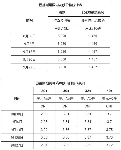 9月21-27日一周,巴基斯坦棉花和棉纱价格双双下跌,涤棉纱价保持坚挺。