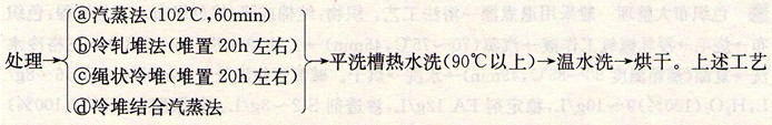 ③净棉酶用于筒子纱练漂。设备:筒子上色机,浴比1:10,528个筒子原纱(每只852g,共重450kg),水量4500L,除氧酶(百胜PC一133),醋酸。净棉酶用量3g/L,H202(浓度27%)7g/L,升温1℃/min。工艺流程:原棉筒子纱装笼一净棉酶SX1处理(95℃,90min)→热水洗(80℃,20min)→醋酸洗(50℃,20min)→除氧(50℃,20min)→待上色。操作:30℃加净棉酶(热水化开),运转10min,升温至70~80℃,加H2O2,运转5min,以1℃/min升温至95℃,保温处理90min,排液,热水洗、醋酸洗、除氧处理。