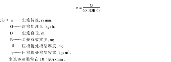尘笼转速快慢直接影响尘笼表面棉层的厚度,棉层的厚度以200~250g/m2为宜。尘笼转速太快,使棉层过薄,导致有效纤维的损失增加;而尘笼转速太慢,使棉层过厚,又会增加排风阻力,甚至造成锯齿轧花机排杂调节板口处落棉增加。尘笼的转速可按下式确定。