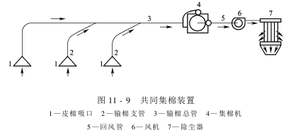 共同集棉装置主要是利用气流把多台轧花机生产的皮棉汇合起来,送往总集棉箱,它也是较为典型的吸送式气力输送装置,主要由皮棉吸嘴、输棉支管、输棉总管、集棉机、回风管、风机、除尘器等部件组成,如图11-9所示。