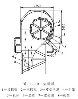 集棉机主要由尘笼、压棉辊、拨棉辊、进棉口、出风口以及罩壳组成,如图11-10所示。