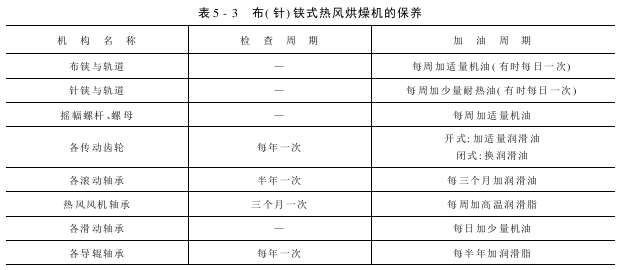 布(针)铗式热风烘燥机的维护保养注意事项和故障处理分别列于表5-3和表5-4中。