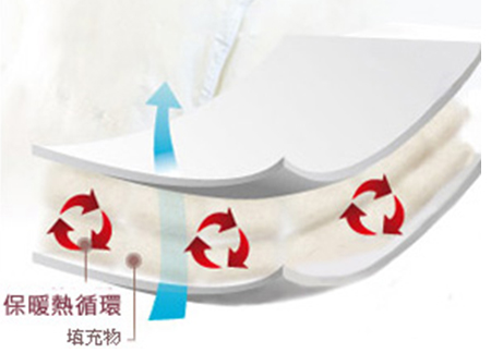 一种是典型意义上的三层保暖,布料和里料采纳纯棉或高含棉量的针织物布料,中间夹有一层增加保暖性能的填充物。价格和保暖效果主要取决于填充物的成分和重量,填充羊绒的价格高,保暖性也好;填充羊毛的次之;填充多孔涤纶、聚丙烯腈纤维的价格相对较低,虽不及羊绒羊毛但也有不错的保暖性能。