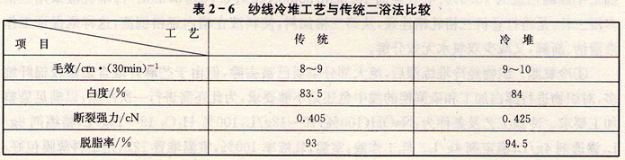 ②工作液配方。NaOH(100%)16g/L,稳定剂KRD3-6~8g/L,渗透精练剂5~8g/L,H2O2(30%)12~14g/L。工作液配制顺序:先加入总水量的3/4,然后加入NaOH及稳定剂、渗透精练剂,搅拌均匀后,临用前加入H2O2,应幸免H2O2和NaOH过早接触。纺纱线堆放要求整齐、平坦、均匀,预防压紧,造成死角。为此,堆放是关键,非常是链状纱堆放,链扣处不能过紧,总之,要求锅内各个部位的纺纱线都能吃透工作液。冷堆工艺后一般毛效偏低,如果在练漂堆放结束后,在往复上色机上进行热洗,水洗液中加2~3g/L清洗剂,于95℃往复洗3~5次,再进行冷洗,可提高水洗效果及毛效。上述工艺条件下生产的纺纱线和传统二浴法相比较,其质量指标见表2-6。