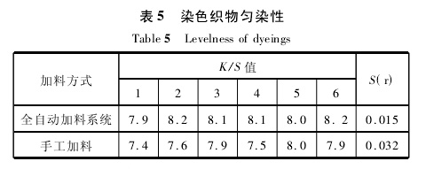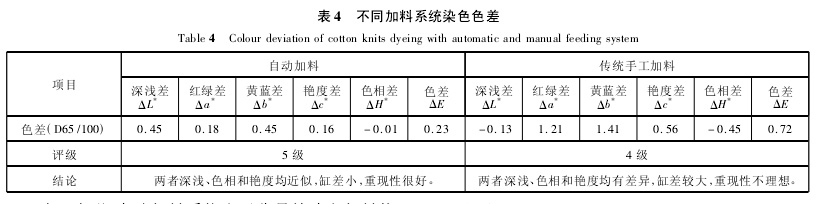 表4表明,自动加料系统由于称量精确和加料均匀稳定,减少了人工称量误差,由此避免了由人为操作引起的缸差,使织物具有较高的符样率,染色重现性比传统后工加料好,提高了染色一次成功率和产品质量。