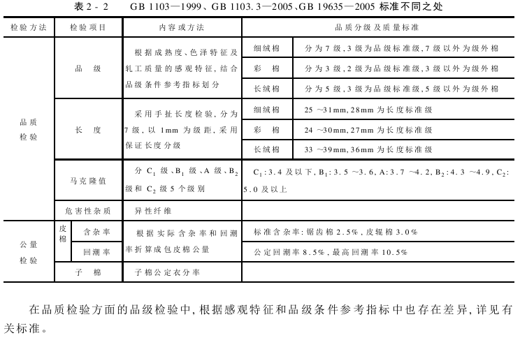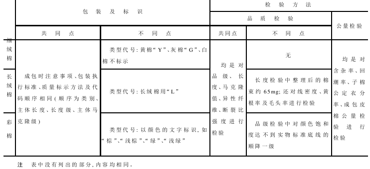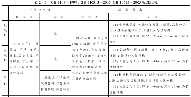 《棉花细绒棉》、《棉花天然彩色细绒棉》和《棉花长绒棉》国家标准进行检验的内容存在着一致性。只是在棉种的特征差异,如对品级的分级、长度分级范围等存在细微的差异,见表2-1。
