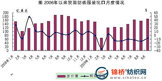 一、月度出口值稳步回升。我国纺织服装月度出口值在2009年2月探底之后快速反弹,3月以来除5月和8月出现小幅波动外,总体呈现稳步回升态势。9月当月出口167.4亿美元,为年内月度出口峰值,同比下降7%,环比增长6.7%(下图)。