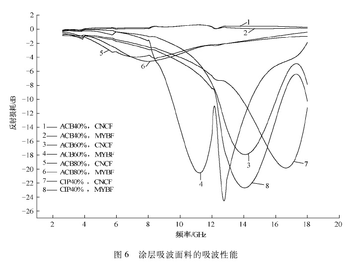 2. 3. 2 基布对涂层面料吸波性能的影响分析图 6 可知,铜镍镀层基布和金属纱线混纺布吸波涂层面料的吸波曲线的趋势基本一致。与铜镍镀层基布( CNCF) 相比,金属纱线混纺布( MYBF)涂层面料反射损耗小于 - 6 dB 的频段更宽,反射损耗小峰值点更低,反射损耗曲线向低频方向移动了 3 GHz 左右。这 2 种导电基布的屏蔽性能存在一定的差异,金属纱线混纺基布是将不锈钢纤维抽成细丝,在布料内部形成网格结构。这种不锈钢纤维网可屏蔽电磁波,当不锈钢网格孔径小于电磁波波长四分之一时,就能有效屏蔽电磁波,其屏蔽效能与金属丝直径、间距及单位长度的电阻有关。铜镍镀层基布是在纺织品上采用真空蒸发或磁控溅射的方式镀膜后,