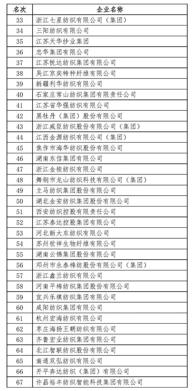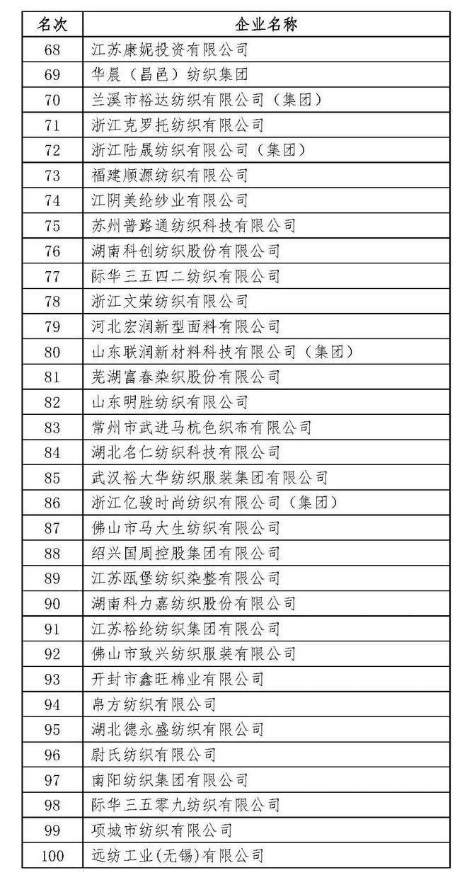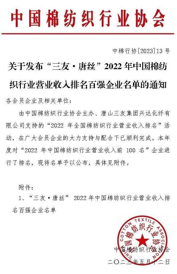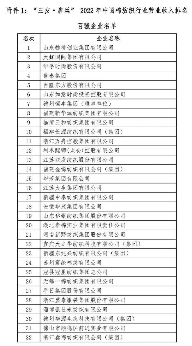 本次大会发布了“2022年全国棉纺织行业营业收入百强企业名单”,名单如下: