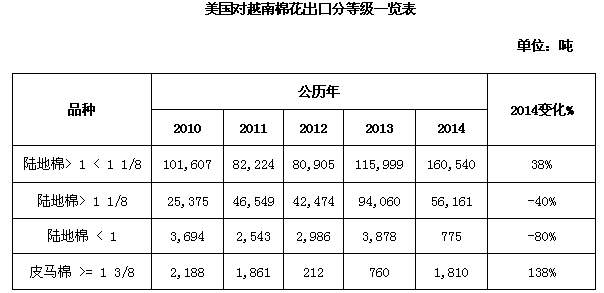 2014年,美国对越南出口棉花21.9万吨,同比增长2%,货值3.93亿美元,同比下降2%。按年度来看,2013/14年度美国对越南出口棉花22.32万吨,货值4.21亿美元,同比分别增长14.6%和20.2%。虽然增速远低于前一个年度,但美棉占越南棉花进口的比重仍高达32.3%。根据美国统计局的数据,2014/15年度前6个月美国对越南累计出口9.88万吨棉花,同比增长8%,但出口额下降了9%,主要原因是越南原棉需求增加而中国进口减少导致国际棉价大幅下跌。预计2014/15年度美国对越南的棉花出口量将维持这个趋势,即数量增加而金额减少。