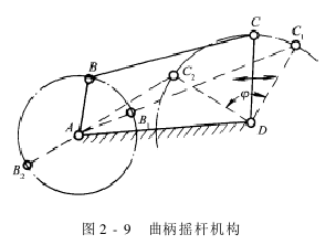 曲柄摇杆机构如图2-9所示,是由四根构件用铰链互相连接而成的。其中,AD构件固定不动,称为机架。AB构件和机架相连接,能做圆周回转休闲,称为曲柄。CD构件也和机架相连接,但只能做肯定角度φ的摆动,称为摇杆。当曲柄AB做圆周休闲时,摇杆CD便以肯定的角度φ做往复摆动。当曲柄AB和连杆BC成一直线时,摇杆便处于摆动的极端位置。图中C1 是右极端位置,C2 是左极端位置。这里必须指出,肯定要在AB小于CD的情况下才能起作用。