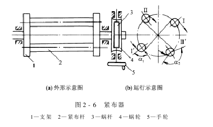 如图2-6(a)所示,紧布器是一种组合的可调式固定导布辊,由支架、调节机构及紧布杆三部分组成。