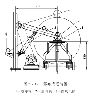 (2)落布辊:落布辊有两只,安装在摇臂的末端,通过皮带轮或链轮传动,其线速度应比布速超速6%~10%左右。落布辊离地面高度应大于1.9m,以保证操作人员的安全。