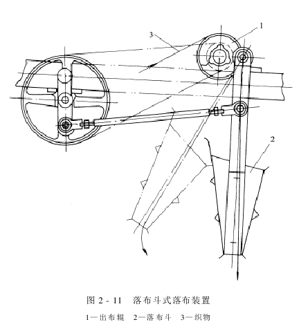 在某些情况下,也有用落布斗代替落布辊的平幅出布装置,如图2-11所示。这种落布斗式平幅出布装置,适合于高支纱的高档轻薄织物,可以幸免布面擦伤及产生松弛漂浮现象。