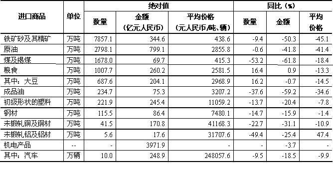六、铁矿砂、煤、原油、成品油等主要大宗商品进口量减少,大豆进口量增加,主要进口商品价格普遍下跌。1月,我国进口铁矿砂7857万吨,减少9.4%,进口均价为每吨438.6元,下跌45.1%;原油2798万吨,减少0.6%,进口均价为每吨2856元,下跌41.4%;煤1678万吨,减少53.2%,进口均价为每吨415.3元,下跌18.4%;成品油234.7万吨,减少37.6%,进口均价为每吨3207元,下跌34.6%;初级形状的塑料221.9万吨,减少13.7%,进口均价为每吨1.11万元,下跌7.8%;钢材115.5万吨,减少14.7%,进口均价为每吨7480元,下跌1.4%;未锻轧铜及铜材41.5万吨,减少22.7%,进口均价为每吨4.12万元,下跌10.9%;未锻轧铝及铝材5.6万吨,减少49.4%,进口均价为每吨3.17万元,上涨47.4%。