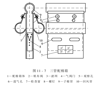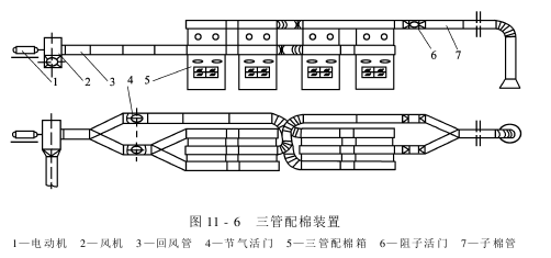 三管配棉装置主要由子棉管、三管配棉箱、回风管、配棉风机、除尘器、阻子活门、节气活门及节气活门换向机构等机件组成,如图11-6所示。