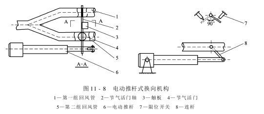 节气活门换向机构的形式较多,使用较为普遍的有电动推杆式和定时盘式两种。电动推杆式节气活门换向机构的结构如图11-8所示,它通过电动推杆的伸缩实现节气活门的换向。节气活门的启、闭时间由时间继电器操纵。定时盘式换向机构节气活门的启、闭时间由凸轮定时盘的形状、转速决策,该机构的大缺点是结构复杂,节气活门的启闭时间不能任意调节,已被淘汰。