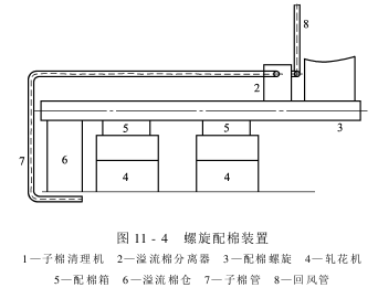 溢流棉输送装置是吸送式气力输送装置,由吸嘴、子棉管、溢流棉分别器、溢流棉回吸风机、空气管及除尘器等机件组成。其主要作用是储存轧花配棉后多余的子棉,或当轧花机出现故障时,储存工艺管道中的子棉。