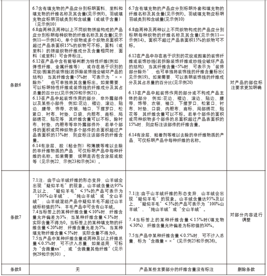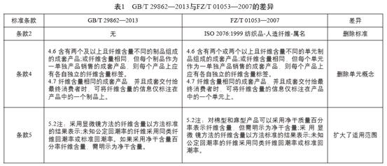 GB/T29862—2013和FZ/T01053—2007两个标准的具体差异详见表1。