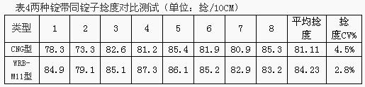 从表4试验数据表明:由于WRB-M11型齿接锭带独特的配方设计,使用该锭带细纱加捻效率得到了有效提升,成纱捻度提高3.85%,成纱捻度不匀率得到改善,成纱质量稳定。