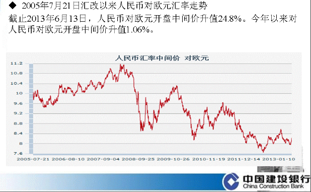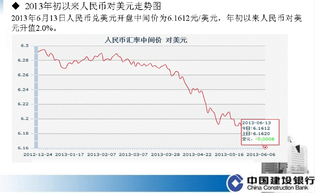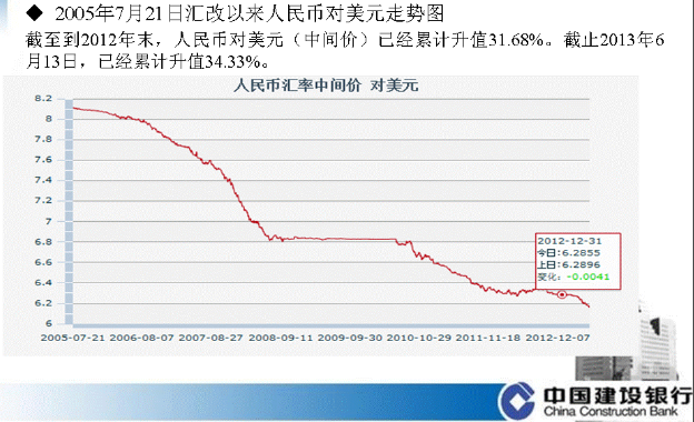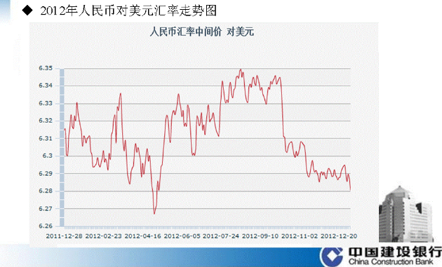 2011年后一个交易日人民币对美元开盘中间价为6.3009元/美元,2012年5月创出开盘中间价的年内高点6.2670元/美元,8月16日则为开盘中间价年内低点6.3495元/美元,2012年后一个交易日的开盘中间价为6.2855元/美元,全年升值幅度为0.25%。年度大升值幅度为0.54%,大跌幅为0.76%,年内大波幅为1.31%。