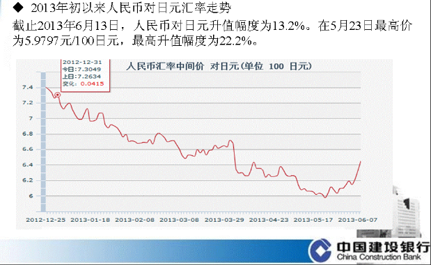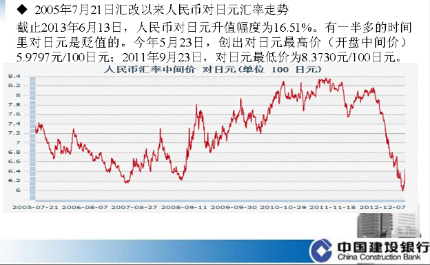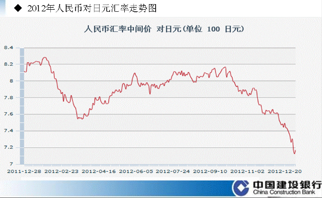 2011年后一个交易日人民币兑日元开盘中间价为8.1103元/100日元,开盘中间价为2011年内高点为12月28日的7.2634,开盘中间价年内低点为2月2日的8.2846,2012年后一个交易日的开盘中间价为7.3049,全年升值幅度为11.03%。年度大升值幅度为11.66%,大跌幅为2.10%,年内大波幅为13.14%.