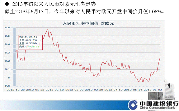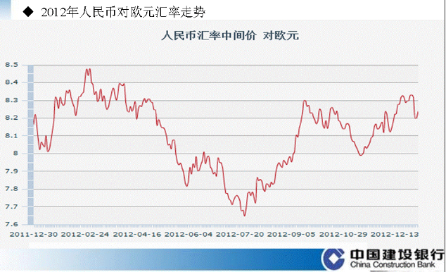 2011年后一个交易日人民币兑欧元开盘中间价为8.3176元/欧元,开盘中间价的年内高点为7月25日的7.6473,开盘中间价年内低点为2月29日的8.4799,2012年后一个交易日的开盘中间价为8.1625,全年升值幅度为1.9%。年度大升值幅度为8.77%,大跌幅为1.91%,年内大波幅为10.33%。