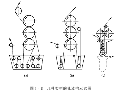 近年来,还有采纳如图3-8(c)所示的轧液槽,其特点是织物在槽内溶液中浸渍时,经小轧辊轧压以挤出织物中的气泡,加上轧液槽较深,可增加溶液静压,有利于溶液向织物渗透。这种轧液槽装有升降设备,槽内导布辊轴承座固定于机架上,以便于穿布和清洁。