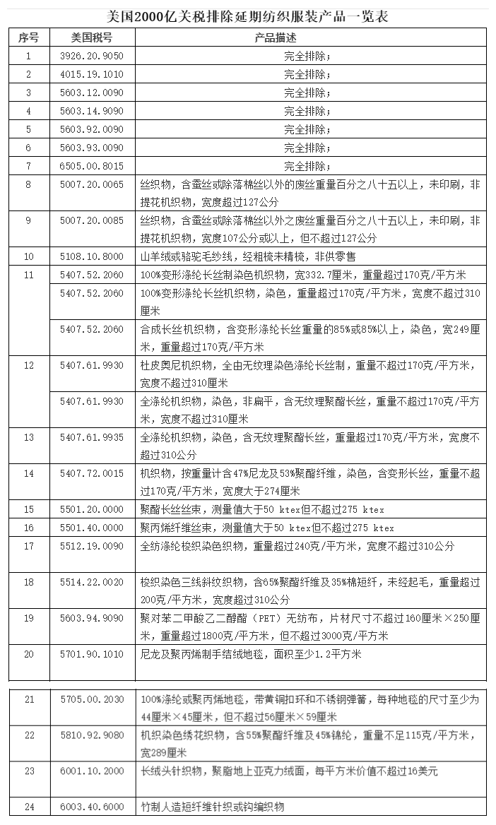 美东时间2020年8月6日,原美国2000亿关税排除产品清单共有997项,获得延长有效期的产品有266项(包含21个完全排除产品),约占原清单的1/4,其中包括纺织服装产品税号24个,排除有效期将自2020年8月7日起延长至2020年12月31日;未获得延长有效期的产品有731项,约占原清单的3/4,其中包括纺织服装产品税号27个,这些产品将于美国东部时间2020年8月7日起恢复加征25%关税。