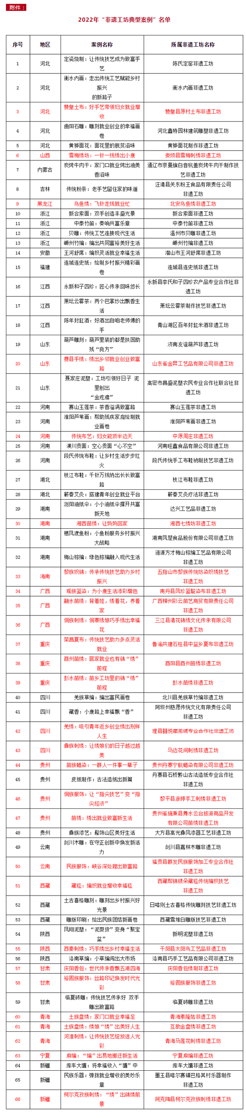 2月3日,文化和旅游部、人力资源社会保障部、国家乡村振兴局发布了2022年“非遗工坊典型案例”名单,确定了66个2022年“非遗工坊典型案例”,其中超四成为刺绣等纺织非遗工坊。