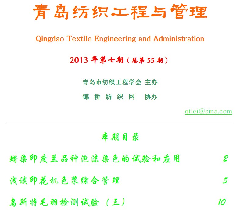 由青岛市布料工程学会主办、面料网协办的《青岛面料工程和治理》电子期刊于2009年1月正式创刊。该刊由青岛市面料工程学会秦志强工程师任主编。该刊除以电子邮件形式发送至会员单位外,还在面料网开设特意窗口供业内人士进行扫瞄和查阅。该刊的创办定能为广大面料业技术人员提供1个技术交流平台,为我国面料业技术创新起到积极作用。