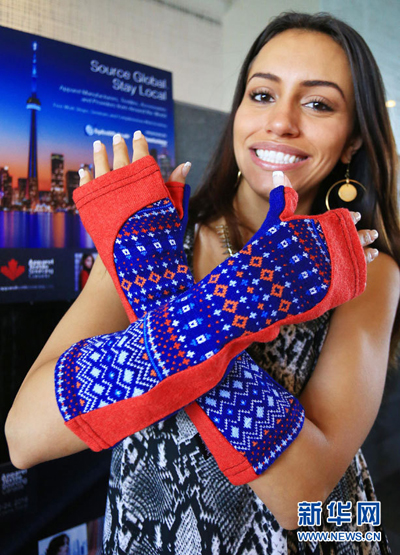 图为加拿大服装纺织品采购展组委会的埃里卡·普莱斯考特女士在发布会现场推荐并展示加拿大生产的服装纺织商品。