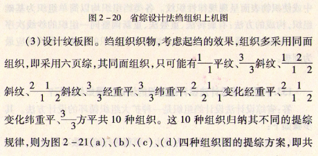 (1)确定采纳的综页数。为使生产顺利进行综页数不宜过多,常用6页或8页两种,现以6页为例,图2-20为省综设计的绉组织上机图。