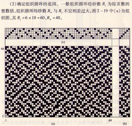 (5)描绘组织图:有了穿综图和纹板图,对比其两者的相互关系,逐一填绘组织图。图2-20(a)图即为该绉组织的组织图。 (4)穿综图设计。图2-20(c)为省综设计法绉组织上机图的穿综图,有了纹板图之后,要充分利用不同的提综规律,扩大经纱组织循环范围,以获得较好的起绉外观效应。