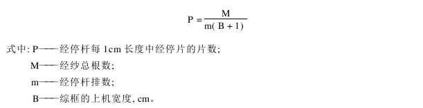 经停片穿在经停杆上的同意密度和经停片的厚度有关,然而经停片的厚度又取决于经纱的特数,每根经停杆上经停片的排列密度用下式计算:
