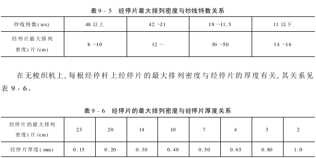 在棉织生产中,每根经停杆上经停片的大排列密度和纺纱线特数有关,纺纱线特数小,经停片密度可大些;纺纱线特数大,密度不能过大。经停片密度和纺纱线特数的关系见表9-5。
