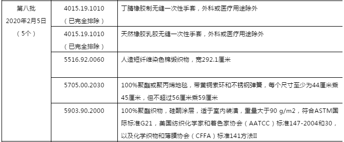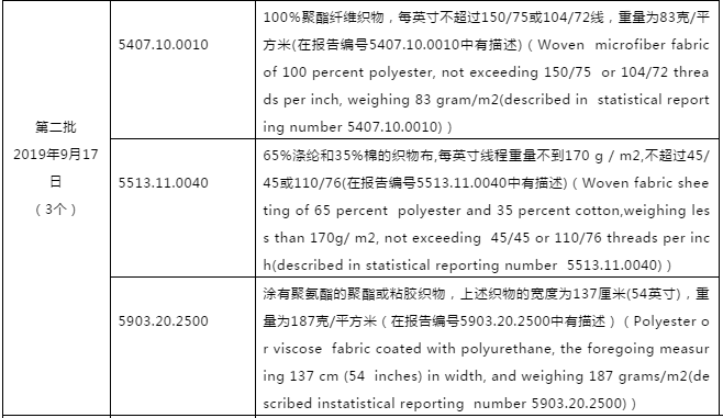 本次排除的纺织品描述与HS码如下: