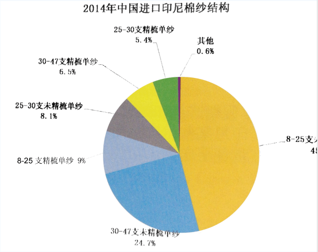 下图所示,中国进口印尼纱的结构如下:8-25支普梳纱占45.7%,30-47支普梳纱占24.7%,8-25支精梳单纱占9%,25-30支普梳纱占8.1%。