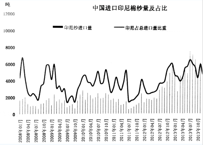 下图所见,2012年下半年开始,中国对印尼的纱线进口显著增加,月均进口量从之前的1000-2000吨快速增加到6000吨以上,2014年8月的进口量突破了1万吨。2014年全年,中国进口印尼棉纱9.3万吨,同比增长45.8%。同时,印尼占中国纱线进口的比重同步提高。2013年开始,印尼占中国棉纱进口的比重从不到3%提高到5-6%。