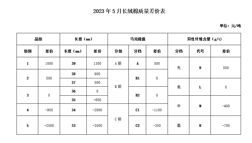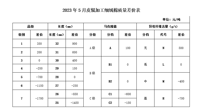依据2023年4月的棉花公检质量数据、中国棉花协会棉花质量价差自动生成系统采集的棉花加工企业销售成交价、纺织企业监测点的采集数据以及当月的中国棉花价格指数,并征求业内专家的意见,2023年5月《中国棉花协会国产棉质量差价表》做如下调整: