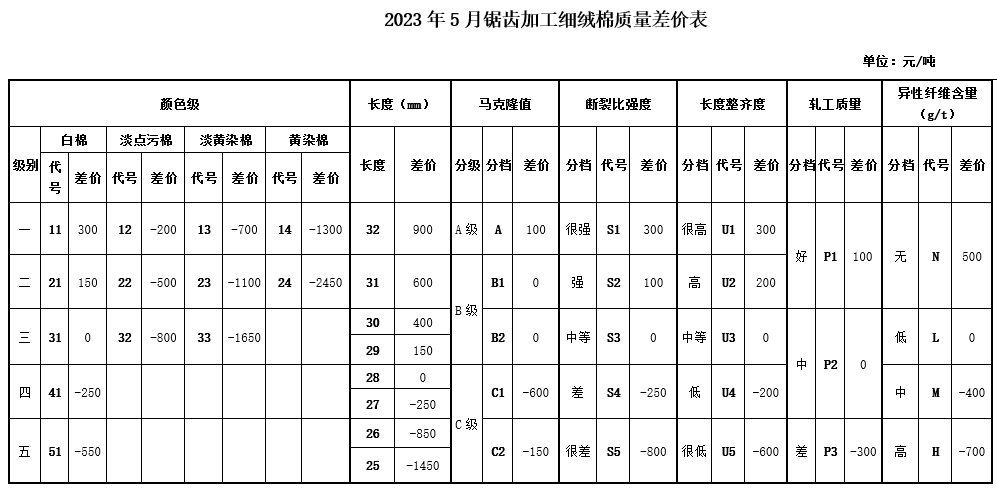 根据《中国棉花协会国产棉质量差价表管理办法》规定,现正式发布2023年5月《锯齿加工细绒棉质量差价表》、《皮辊加工细绒棉质量差价表》和《长绒棉质量差价表》(单位:元/吨)。