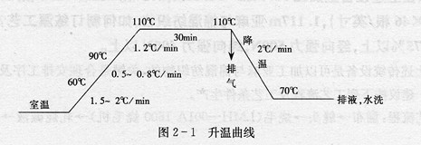工艺处方:NaOH(100%)6g/L、H2O2(100%)49/L、渗透剂JFC 1.5g/L、太古油0.8g/L、氯化镁0.5g/L、稳定剂A702 4g/L、水玻璃4g/L、消泡剂0.5g/L。升温曲线(全过程为2h)如图2-1。先分别将NaOH、稳定剂、渗透剂JFC、太古油、氯化镁加入机内,运行片刻加入消泡剂,升温至60℃加入双氧水;然后按升温曲线进行工作。半制品质量:退浆率95%、毛效15.8cm/30min,白度90%。处理用水完量使用软水,以幸免硬水中的重金属离子加速双氧水分解;若无软水,应加软水剂。加入消泡剂的目的是预防在运行过程中,由于泡沫而使织物堵塞喷射管。操作时采纳二快一慢升温工艺。即在室温时升温至60℃时,升温速率可快些,以1.5℃/min为宜;60~90℃时,可放慢升温速率,以0.5~0.8℃/min为宜;超过90℃时,则以1.2℃/min为宜,但仍不能过激,以免双氧水过分剧烈分解产生过大的气体压力,而无法操纵。