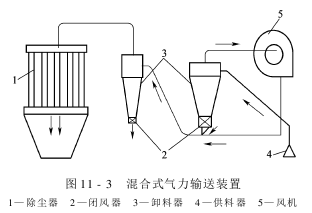 混合式气力输送装置在风机的吸气管段和压气管段都进行物料的输送,即由吸送式和压送式组合而成,如图11-3所示。