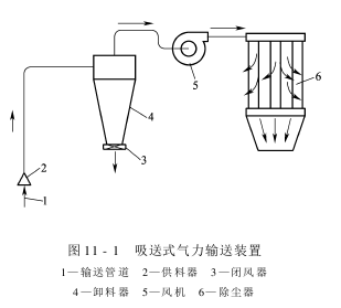 吸送式气力输送装置是利用通风机,将空气和物料吸入输料管,输送至卸料地点。它常用于车间内部的物料输送,如图11-1所示。
