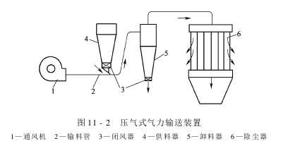 压送式气力输送装置是利用通风机压出的气流,通过输料管时再混入物料进行输送的,如图11-2所示。物料的输送过程是在风机压气段一侧完成的。