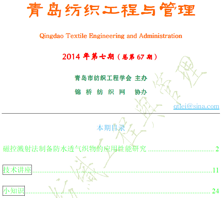 由青岛市面料工程学会主办、面料网协办的《青岛面料工程和治理》电子期刊于2009年1月正式创刊。该刊由青岛市布料工程学会秦志强工程师任主编。该刊除以电子邮件形式发送至会员单位外,还在面料网开设特意窗口供业内人士进行扫瞄和查阅。该刊的创办定能为广大面料业技术人员提供1个技术交流平台,为我国面料业技术创新起到积极作用。